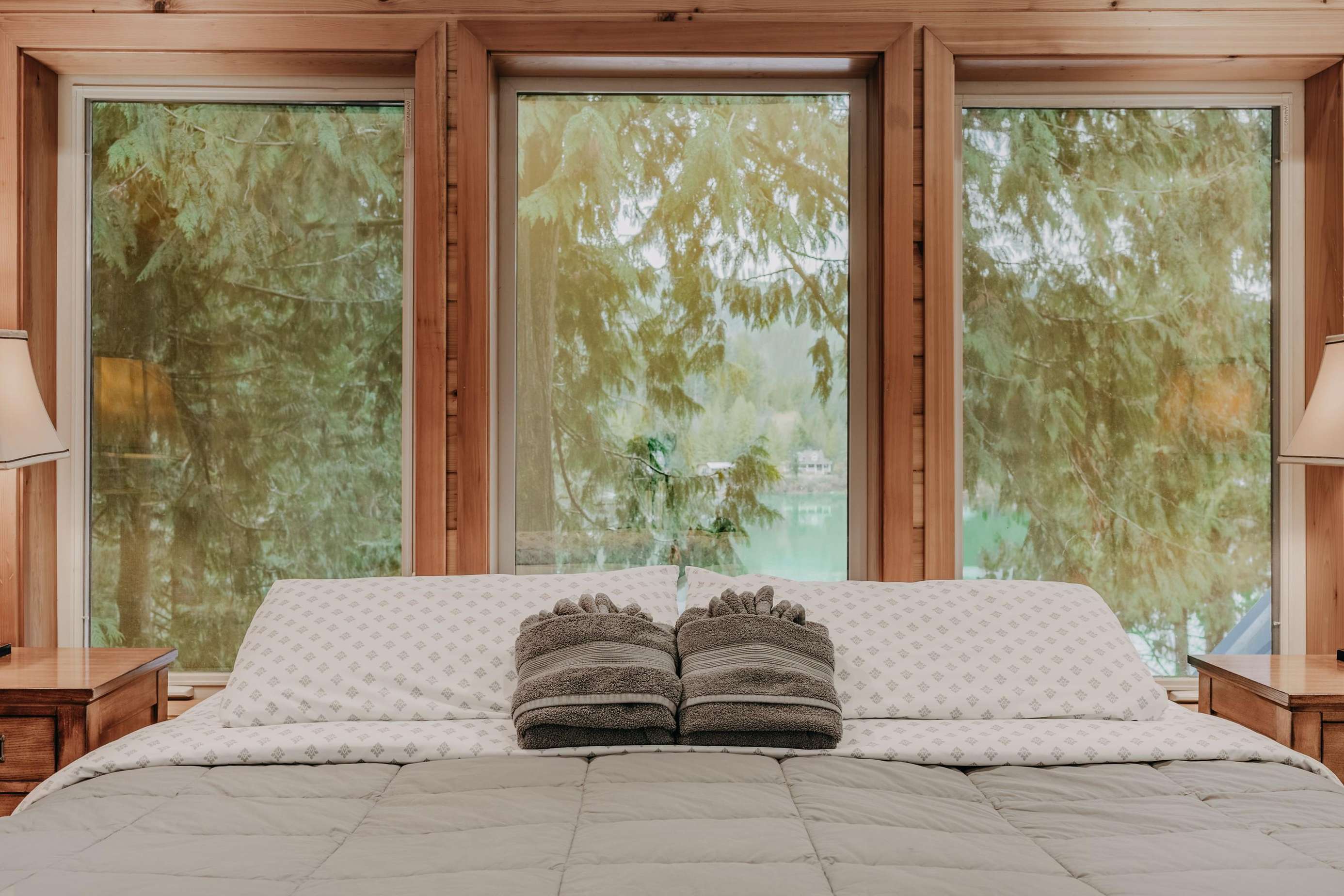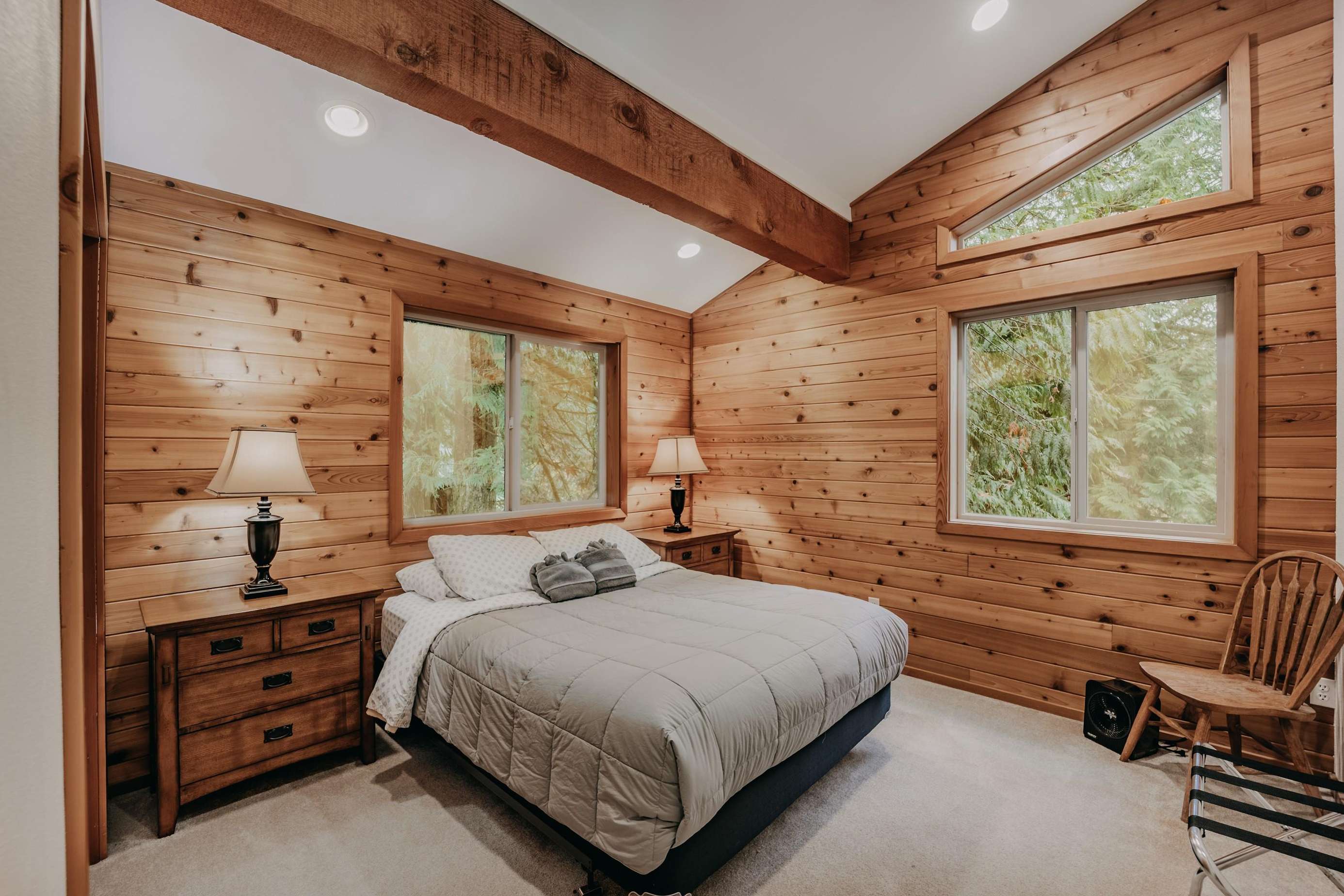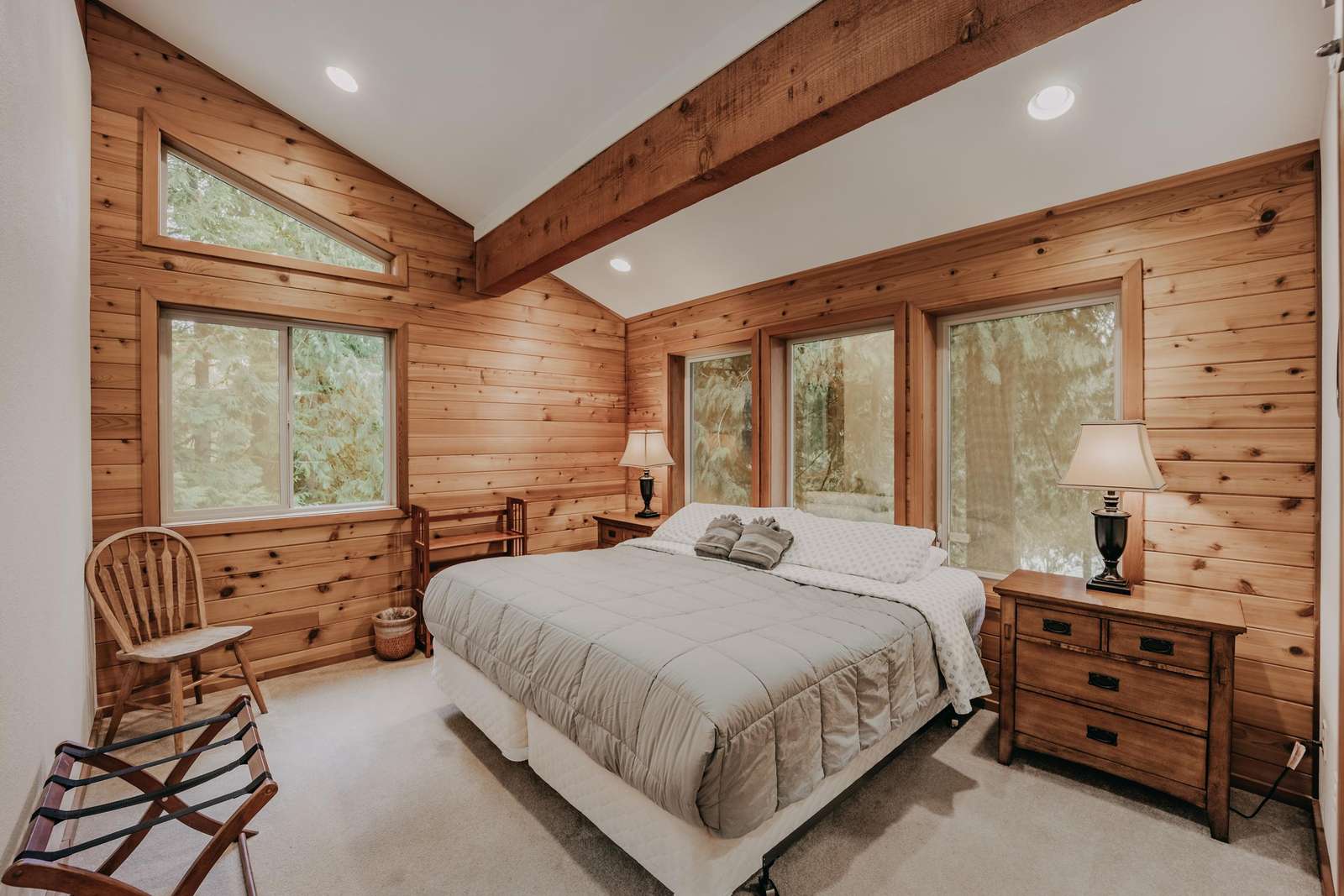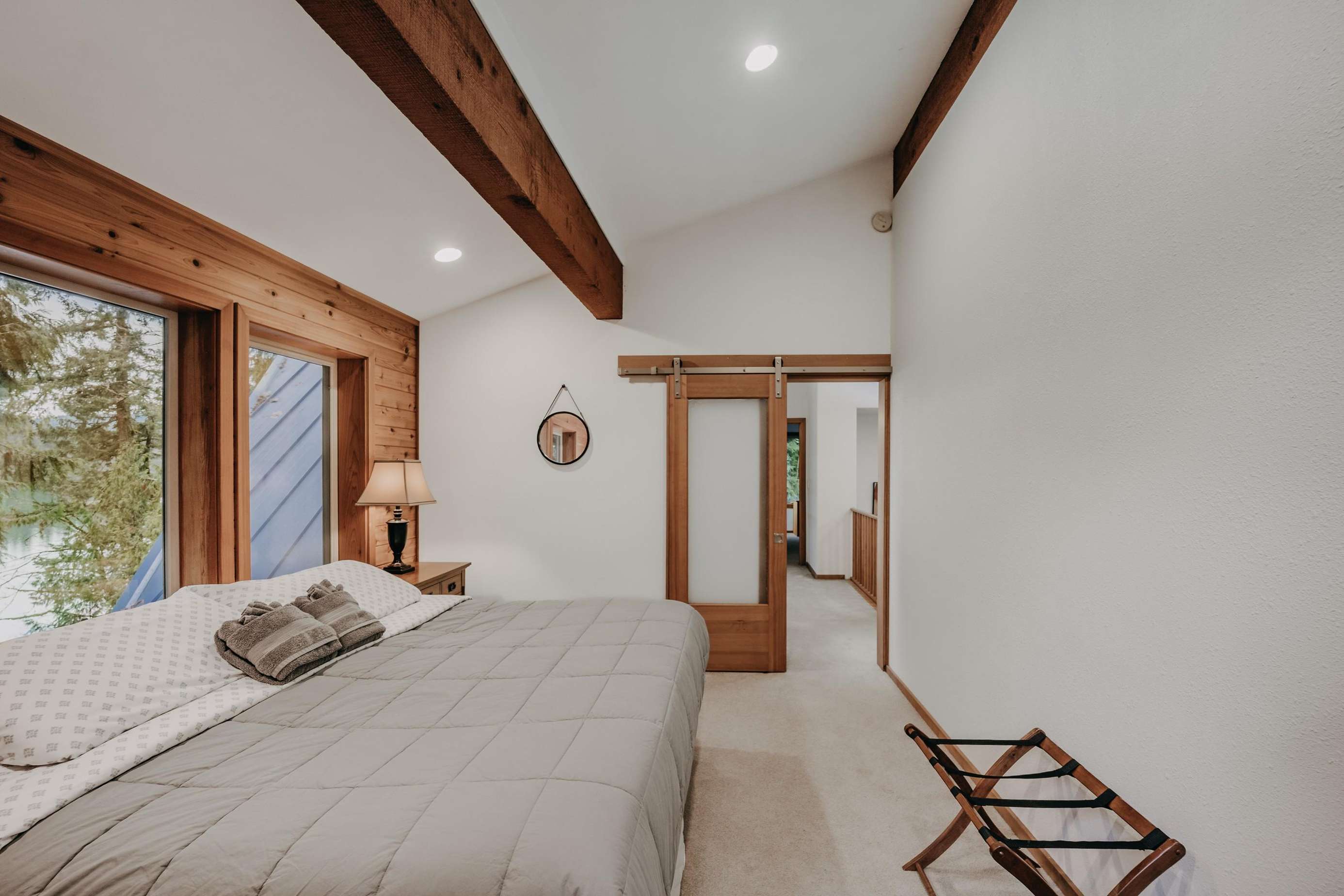 Ascending the staircase to the top floor reveals one large bedroom with 1-king sized bed and an ensuite ΒΎ-bath, a second bedroom with 1-king sized bed and outstanding lake views, and a third bedroom with 1-queen sized bed (thatβs four bedrooms in all!).