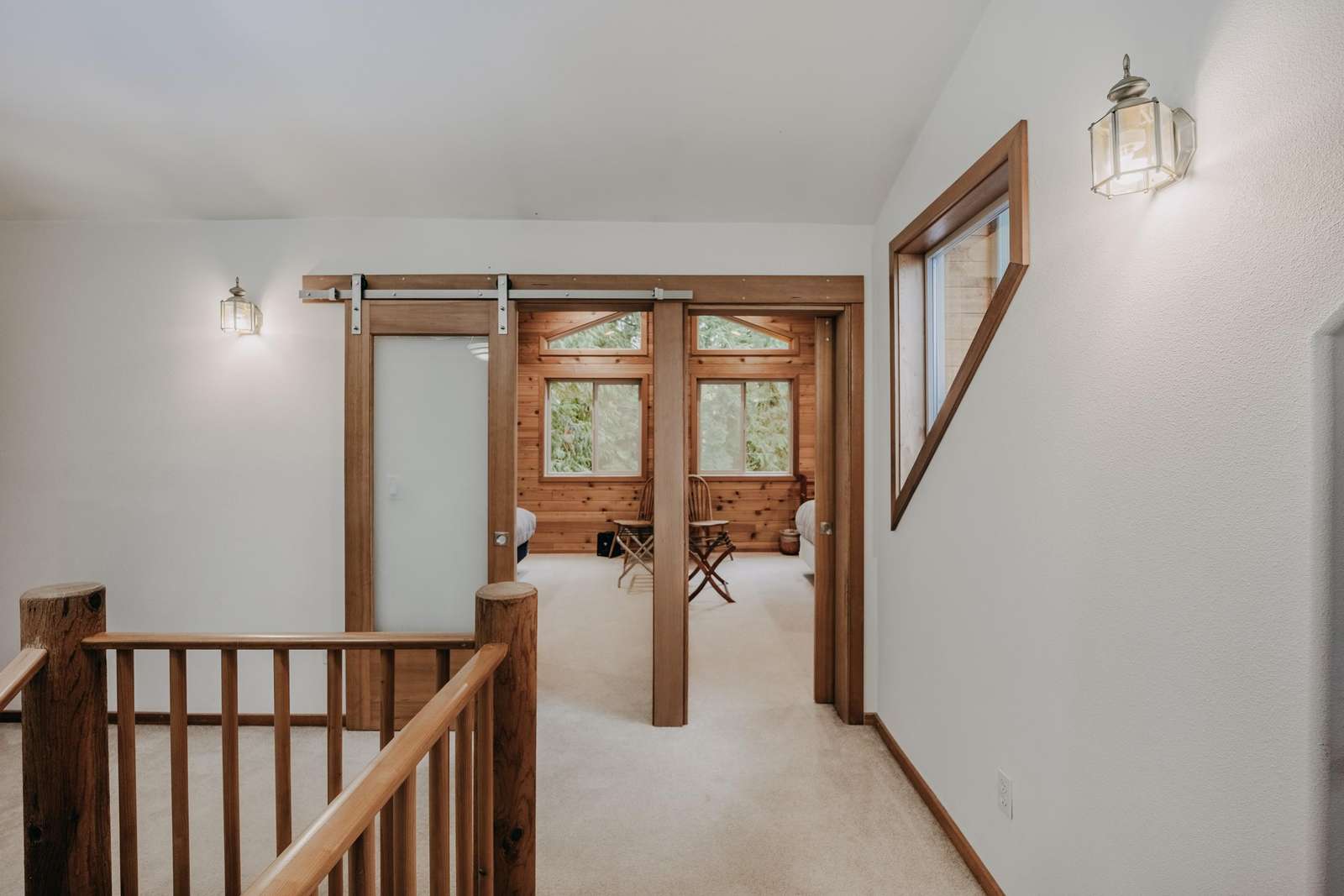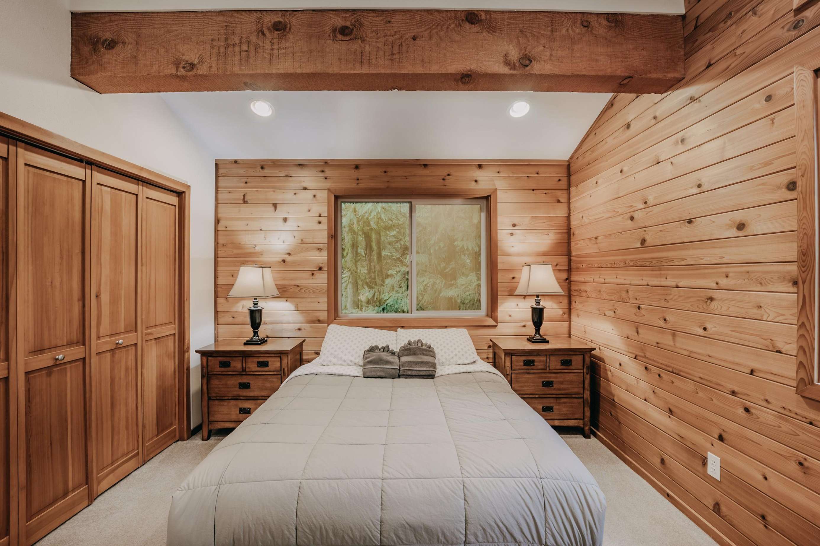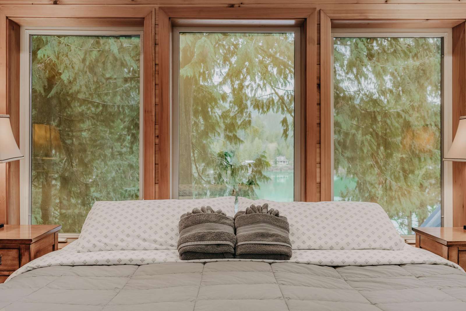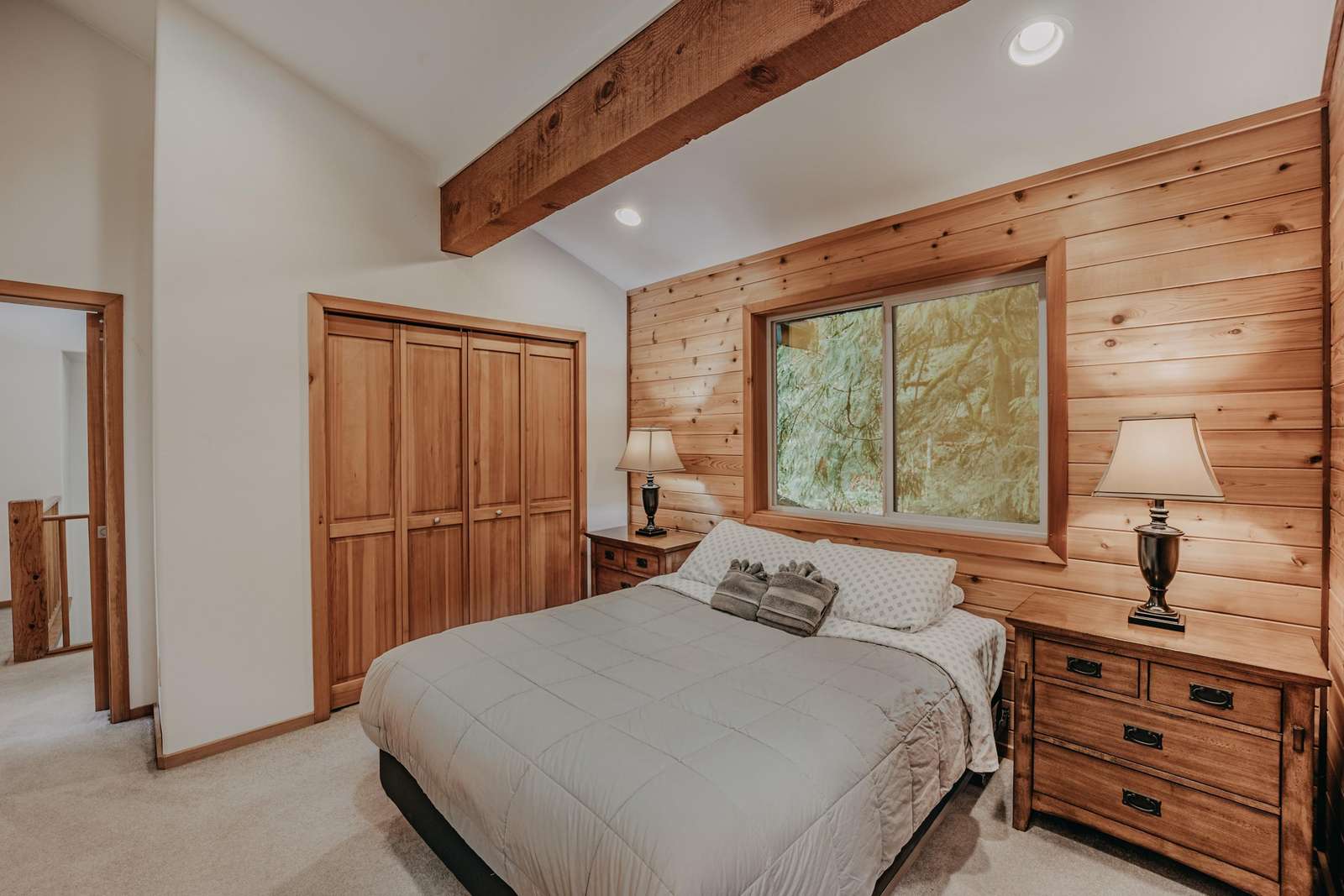 Ascending the staircase to the top floor reveals one large bedroom with 1-king sized bed and an ensuite ΒΎ-bath, a second bedroom with 1-king sized bed and outstanding lake views, and a third bedroom with 1-queen sized bed (thatβs four bedrooms in all!).